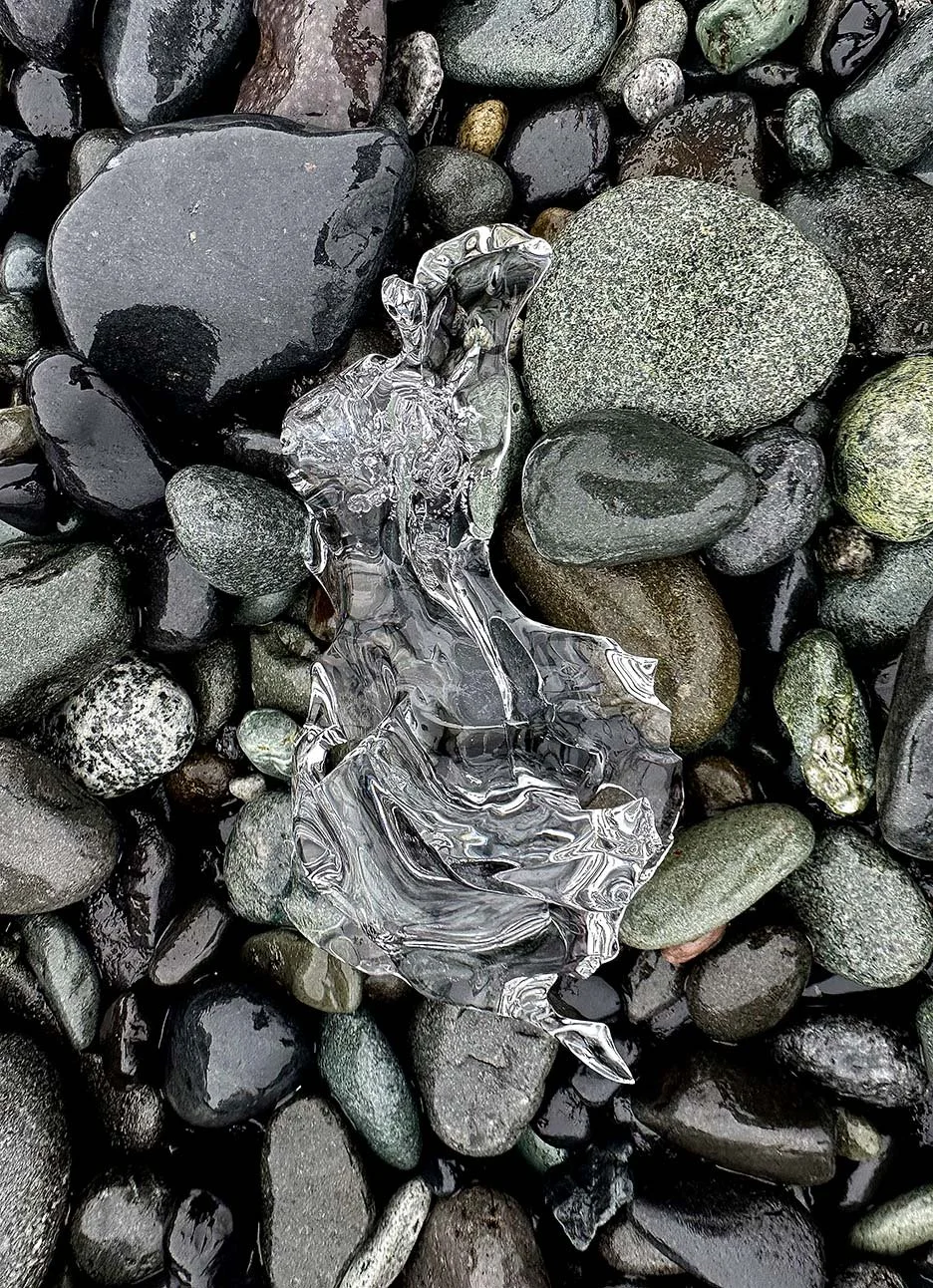 I found this remnant resting amongst the smooth stones shaping the melting of the ice. Glimmering amongst textures that look crafted by artisans.
